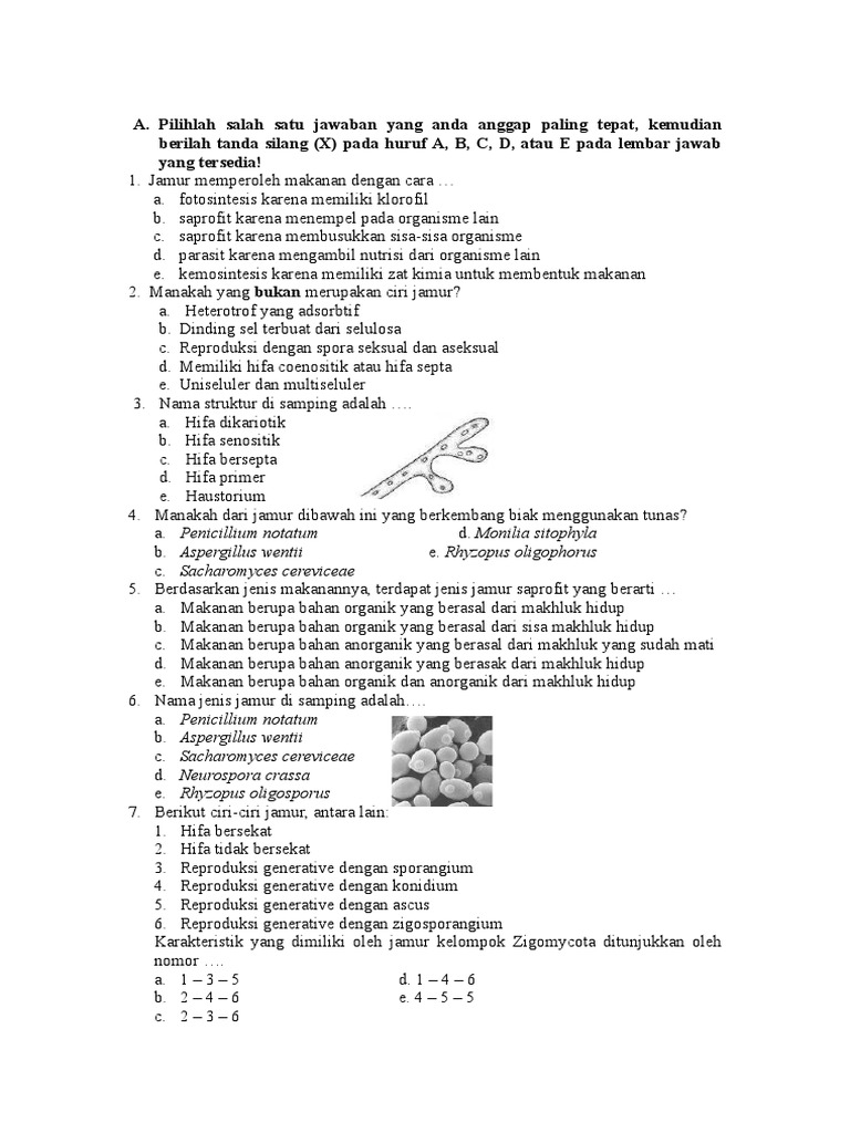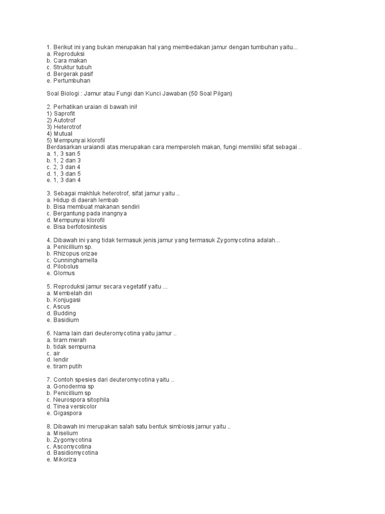 Tuliskan beberapa contoh jamur yang termasuk dalam divisi zygomicota! Anonymous pada soal dan jawaban jamur fungi pilihan ganda. Apr 20, 2019 · poin terbaik soal hots materi jamur adalah : Jamur atau fungi dan kunci jawaban (50 soal pilgan) 2. 10 contoh soal pilihan ganda dan jawaban tentang reproduksi soal sridianti com.