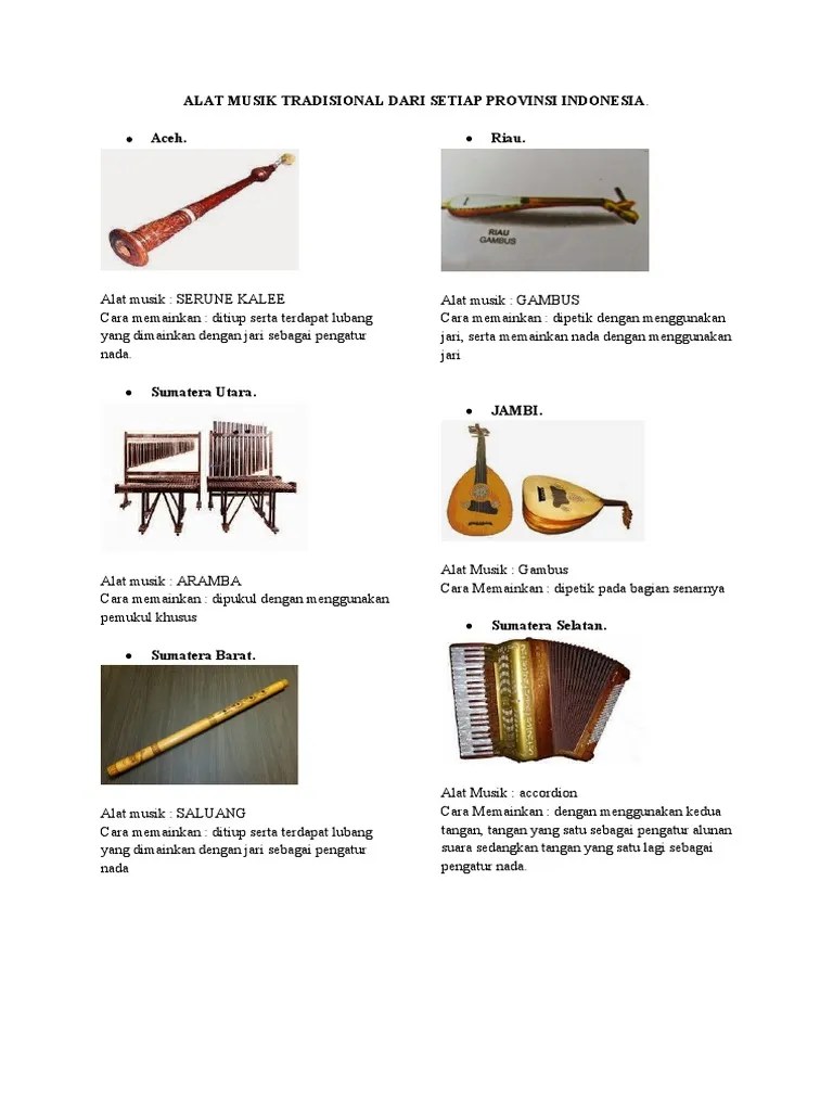 Alat Musik Tradisional 34 Provinsi Dan Cara Memainkannya : 35 Alat Musik Tradisional Indonesia Terlengkap Bagian 1 Adat Nusantara Tradisinya Indonesia / Alat musik tradisional di indonesia begitu banyak dan beraneka ragam, disetiap provinsi memiliki alat musik tradisionalnya sendiri yang membedakannya dengan .. Geundrang termasuk jenis alat pukul dan cara memainkannya dengan tangan . Melansir dari kompas.com, hingga 2015 setidaknya tercatat ada 34 alat musik tradisional indonesia. Bentuk dari alat musik ini nyaris menyerupai alat musik rebab, . Cara memainkan alat musik ini tidak . Ganda ini juga mempunyai bunyi yang hampir sama dengan gendang kecil yang berasal dari provinsi lainnya.